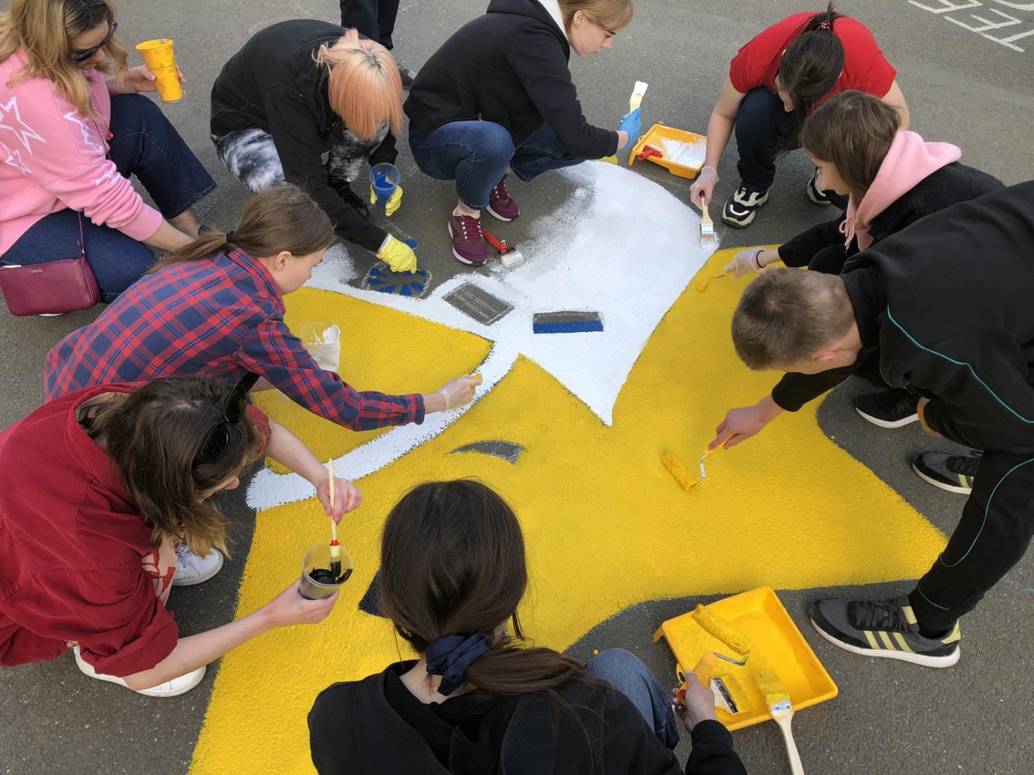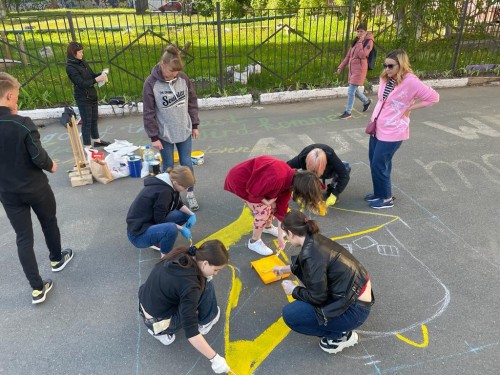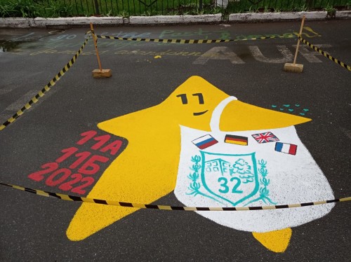 Традиционно выпускники 11-х классов нашей школы, завершая обучение, на память о себе и своем выпуске оставляют на асфальте перед школой рисунок, отражающий видение ребят себя и школы.